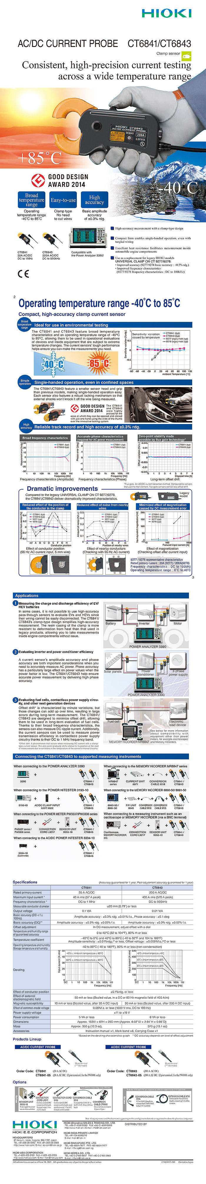 | Rated current | 20 A AC/DC | | Max. allowable input | 40 A continuous (requires derating at frequency or temperature) | | Frequency characteristics | Amplitude: DC to 1 MHz Phase: DC to 300 kHz | | Amplitude and Phase accuracy | DC ¡¾0.3 % rdg. ¡¾0.05 % f.s. (Phase: Not defined) DC < f ¡Â 100 Hz ¡¾0.3 % rdg. ¡¾0.01 % f.s. (Phase: ¡¾0.1 deg) Defined to 1 MHz | | Power consumption | 5 VA max. (at 20 A/55 Hz, ¡¾12 V power requirement) | | Output voltage | 0.1 V/A (CT6841), 0.01 V/A (CT6843) (voltage output with the Sensor Unit 9555-10, use with a device having a 1 M¥Ø input resistance or higher) | | Core diameter | ¥õ 20 mm (0.79 in) | | Operating temperature, humidity | -40 ¡ÆC to +85 ¡ÆC (-40 ¡ÆF to 185 ¡ÆF), 80% rh or less (with no condensation) | | Power supply | DC ¡¾11 V to ¡¾15 V (Power suppled via the 9555-10, 9555-10 supports 100 to 240 V AC) | | Dimensions and mass | 153 mm (6.02 in)W ¡¿ 67 mm (2.64 in)H ¡¿ 25 mm (0.98 in)D, cord length: 3 m (9.84 ft), 350 g (12.3 oz) | | Accessories | Instruction manual ¡¿1, Mark bands ¡¿6, Carrying Case |